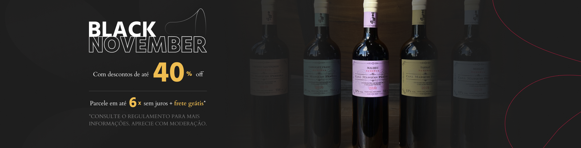 Black November na Vinícola Casa Marques Pereira: descontos de até 40% em vinhos premiados. Aproveite tintos, brancos, rosés e espumantes de 03 a 28 de novembro.